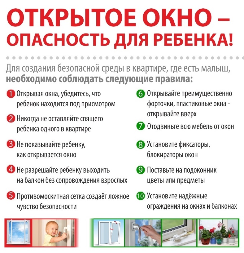 Наступает тёплый период, и многие родители забывают о том, что открытое окно может быть смертельно опасно для ребёнка. Падение из окна — является одной из основных причин детского травматизма и смертности, особенно в городах. Дети очень уязвимы перед раскрытым окном из-за естественной любознательности. Каждый год от падений с высоты гибнет огромное количество детей. Будьте бдительны!